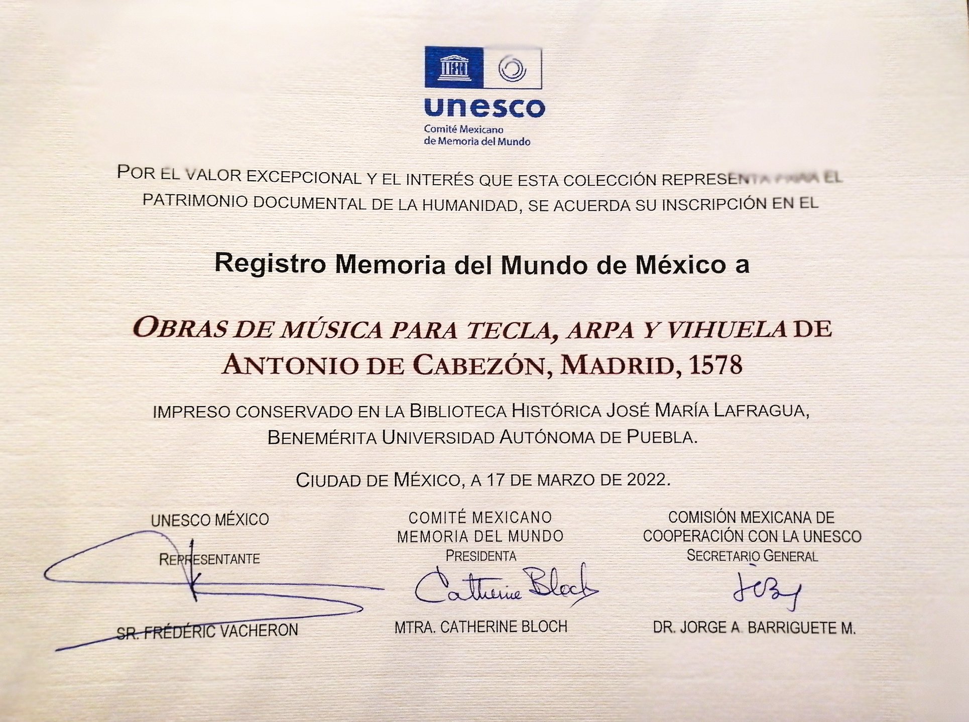 Las Obras de música para tecla, arpa y vihuela constituye el cuarto registro de la Biblioteca Histórica José María Lafragua ante el Comité Mexicano, al que se suma uno más en el Comité Regional de Memoria del Mundo. También representa el primer impreso extranjero registrado en el Comité Mexicano, como un compromiso por la preservación de tan invaluable ejemplar.