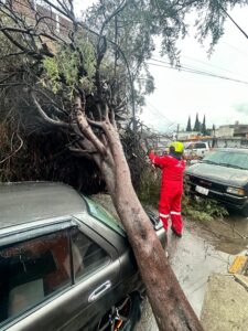 Por lo anterior, personal de Protección Civil acudió a la colonia San Rafael Oriente, donde fue reportada la caída de un árbol que afectó la estructura de un automóvil estacionado. Elementos de Protección Civil Municipal, con herramienta especializada, seccionaron el árbol, realizaron la mitigación de riesgos y liberaron la vialidad para permitir la movilidad.