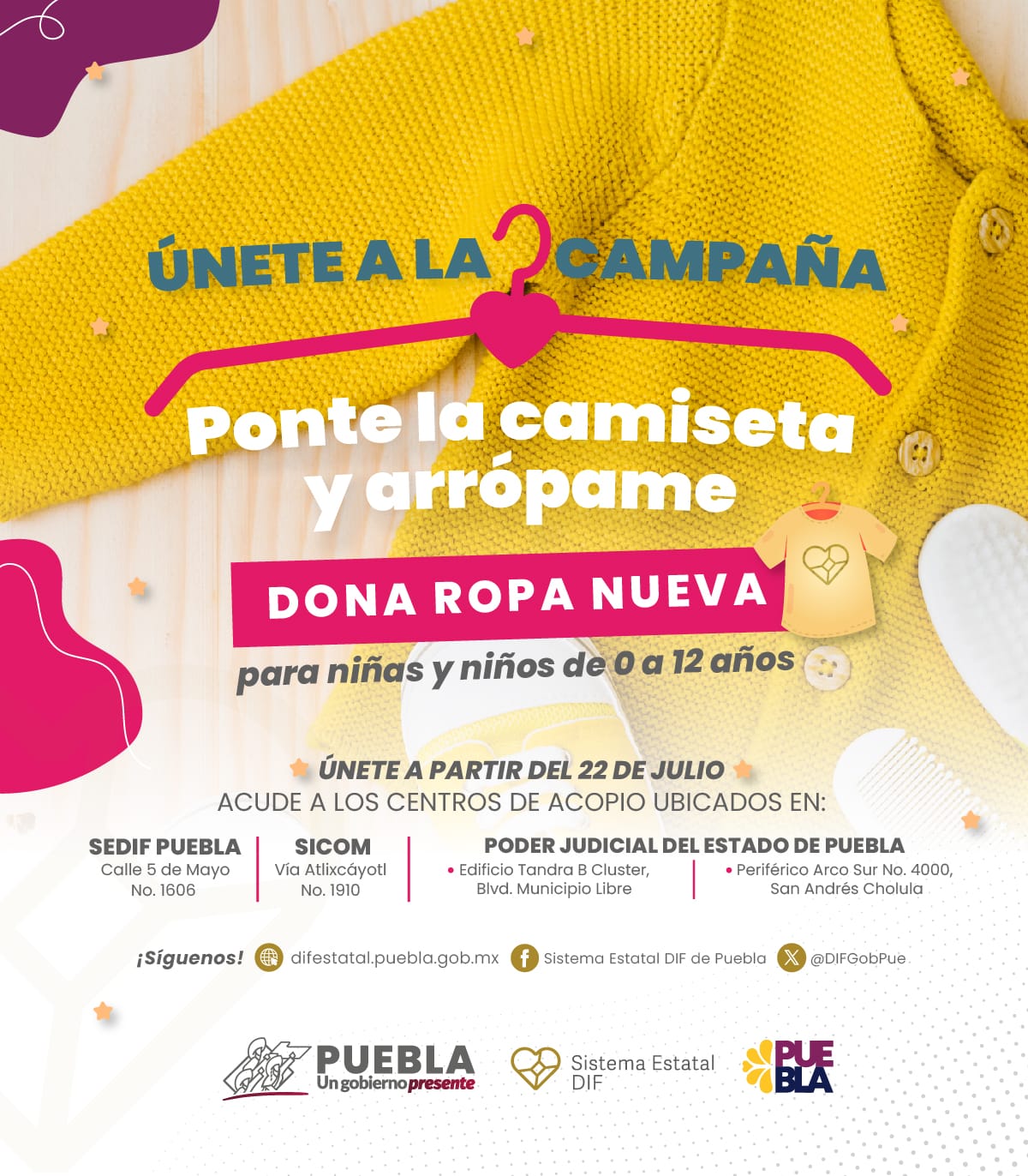 El SEDIF habilitó centros de acopio ubicados en: oficinas centrales del organismo, con dirección sobre calle 5 de Mayo, No. 1606, Centro Histórico; Sistema de Información y Comunicación (SICOM), con sede en Vía Atlixcáyotl No. 1910, Reserva Territorial Atlixcáyotl. Además, el Poder Judicial del Estado de Puebla se sumará a esta campaña con recepción de vestimenta en dos direcciones: Edificio Tandra B Clúster, Bulevar Municipio Libre, así como al interior de Ciudad Judicial con domicilio en Periférico Arco Sur No. 4000, San Andrés Cholula.
