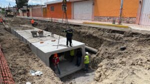 “Este colector pluvial contará con una longitud de 415 metros y estará conformado por cajones individuales prefabricados de concreto armado con una medida por pieza de 1.50 metros de alto y 3 metros de ancho. Adicionalmente, reubicamos 420 metros de drenaje sanitario y 420 metros de red hidráulica y tenemos contemplado ejecutar una obra de captación y una de descarga”, precisó.