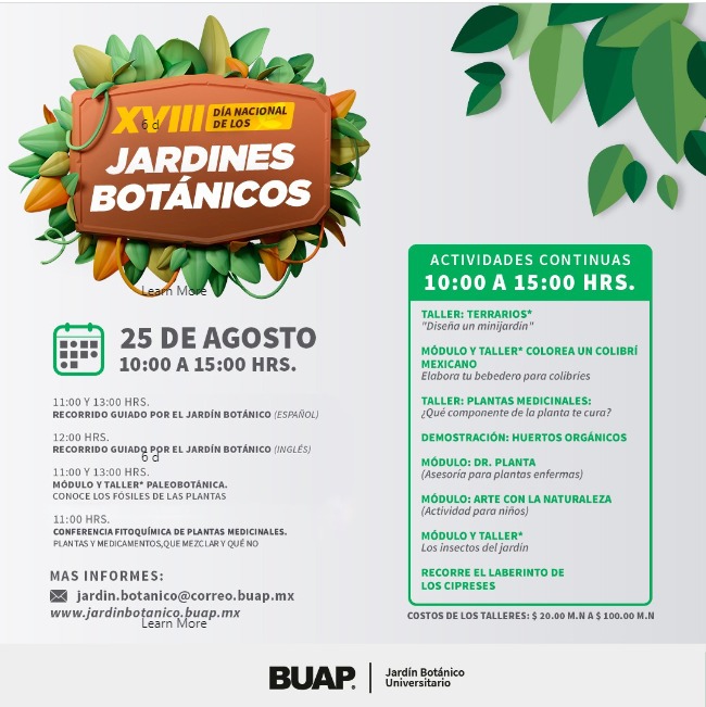 Con motivo del XVIII Día Nacional de los Jardines Botánicos, la Benemérita Universidad Autónoma de Puebla ofrecerá diversas actividades en el Jardín Botánico ubicado en Ciudad Universitaria, para que lo disfrutes con toda tu familia este próximo 25 de agosto.