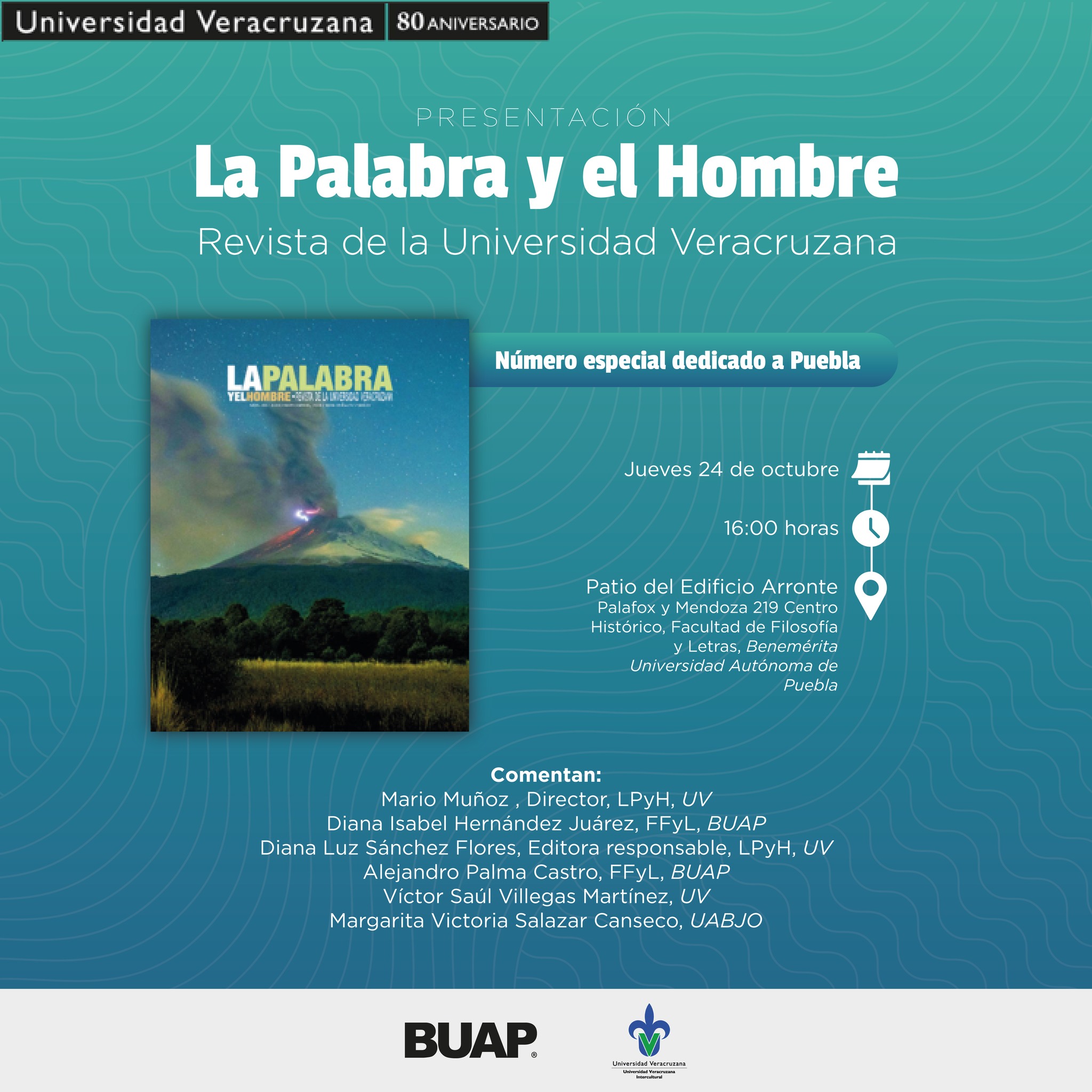 La Benemérita Universidad Autónoma de Puebla invita a la Presentación de la Revista “La Palabra y el Hombre”, creada por la Universidad Veracruzana, que en esta ocasión presenta un número especial dedicado a Puebla, este próximo 24 de octubre de 2024 a las 16:00 horas, en el Patio del Edificio Arronte (Palafox y Mendoza 219, Centro Histórico).