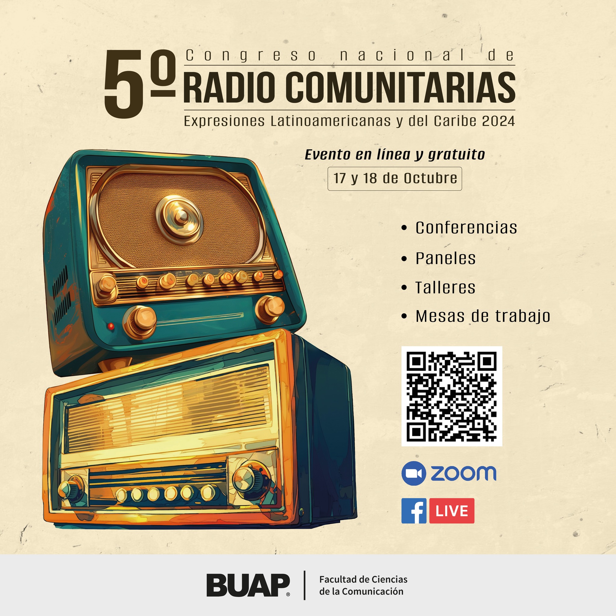 La Facultad de Ciencias de la Comunicación de la Benemérita Universidad Autónoma de Puebla, convoca a las y los integrantes de radios ciudadanas, comunitarias, indígenas, campesinas, estudiantiles y suburbanas, así como de programas radiofónicos de divulgación científica y difusión cultural; a especialistas en medios de comunicación e información; investigadoras e investigadores; docentes y estudiantes de licenciatura y posgrados en Comunicación o áreas afines para ser parte del 5to Congreso Nacional De Radios Comunitarias: Expresiones Latinoamericanas Y Del Caribe.