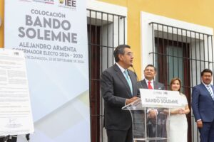 El gobernador Sergio Salomón presidió la colocación del bando solemne para dar a conocer a las y los poblanos el nombramiento de Alejandro Armenta como gobernador electo, para el periodo del 14 de diciembre de 2024 al 13 de diciembre de 2030.