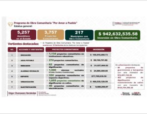 Finalmente, agregó que mil 655 planes transforman la urbanización con mejores calles y caminos; 40 proyectos amplían la electrificación, al llevar luz a más hogares y comunidades. Asimismo, en la capital poblana se realizaron 785 asambleas y se destinó una inversión de 238 millones 538 mil pesos.