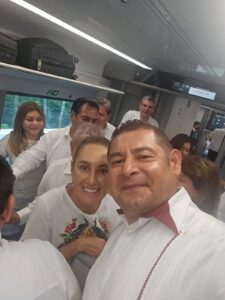 El gobernador electo de Puebla, Alejandro Armenta, se encuentra en la gira por la Península de Yucatán que encabezan el presidente Andrés Manuel López Obrador y la presidenta electa, Claudia Sheinbaum para inaugurar los nuevos vagones del Tren Maya, que al contar con tramos electrificados permitirá que viajen a una velocidad promedio de 160 kilómetros por hora, además incluye espacios como dormitorios y restaurante.