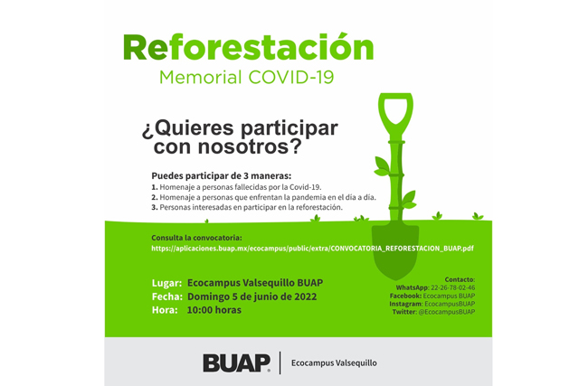 Para mayores informes sobre la Reforestación del Memorial COVID-19 comunicarse por WhatsApp al número 22 26 78 02 46; en Facebook, Instagram y Twitter como EcocampusBUAP; así como al correo electrónico ecocampus.valsequillo@correo.buap.mx.