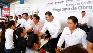 -En Tecamachalco, el gobernador Alejandro Armenta encabezó la entrega de certificados del Programa de Obra Comunitaria.