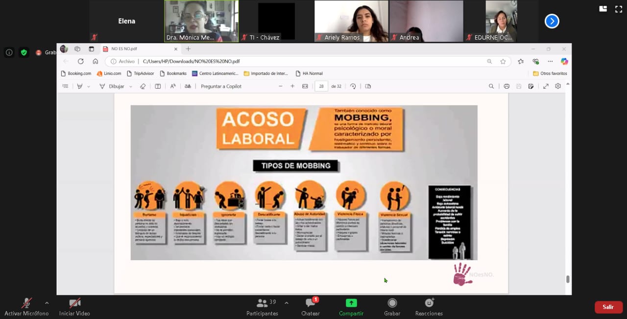 A través de la Unidad para la Igualdad de Género del Congreso del Estado, se llevó a cabo la charla virtual denominada “No es no”, a cargo de la doctora Mónica Mendoza Madrigal, quien dio un panorama general de los diferentes tipos de violencia en el entorno social y laboral.
