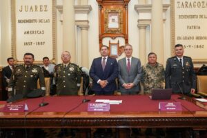 Como invitados especiales también estuvieron presentes en la sesión el Vicealmirante Francisco Sánchez González, secretario de Seguridad Pública del Estado de Puebla; General Vicente Javier Mendujano Acevedo, coordinador Estatal de la Guardia Nacional en Puebla; General Héctor Ávila Alcocer, comandante de la Sexta Región Militar y General Santos Gerardo Soto, comandante de la XXV Zona Militar en Puebla.