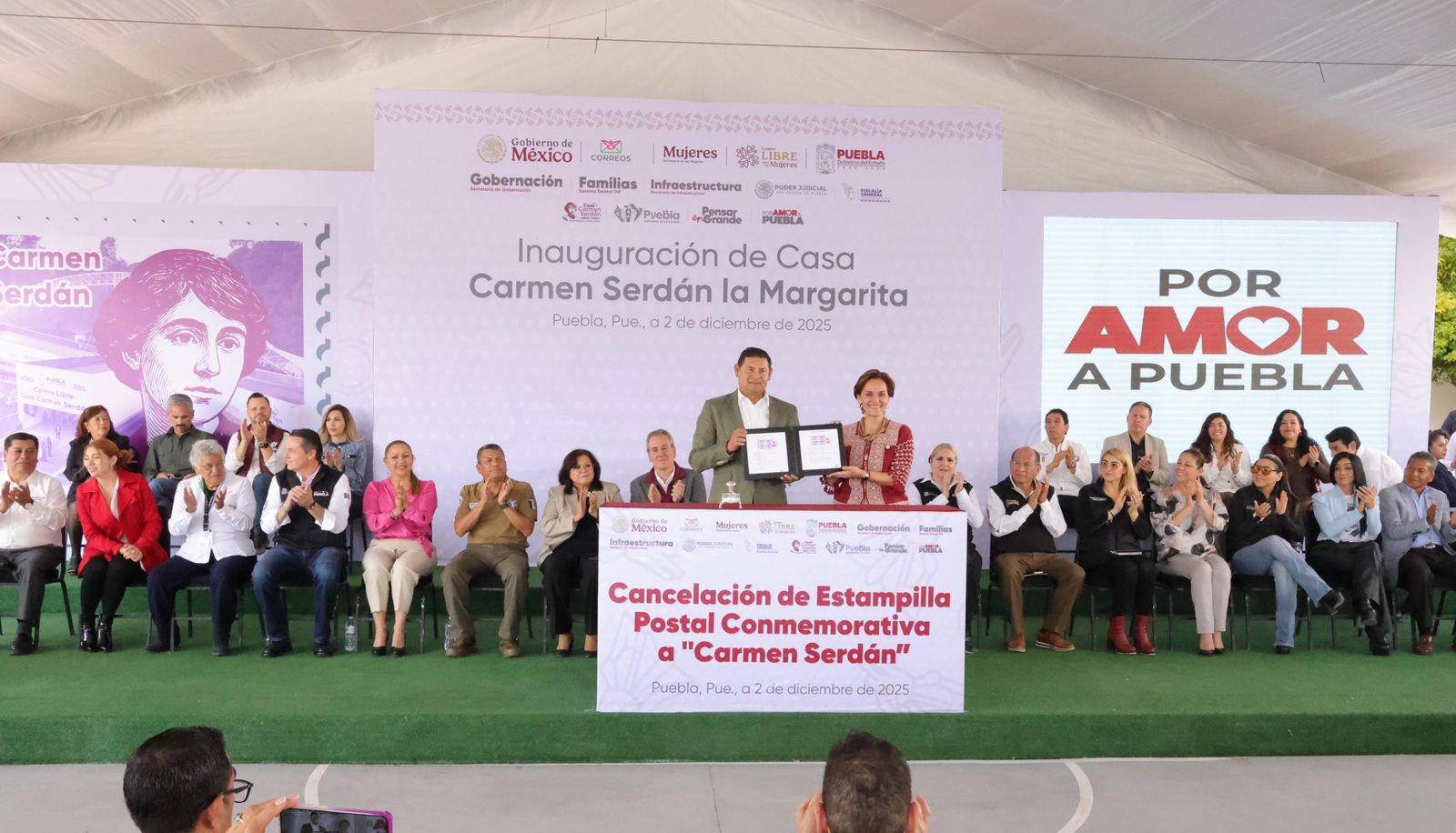 – La directora general de Correos de México, Violeta Abreu González y el gobernador Alejandro Armenta, encabezaron la cancelación de la estampilla postal conmemorativa a “Carmen Serdán”.