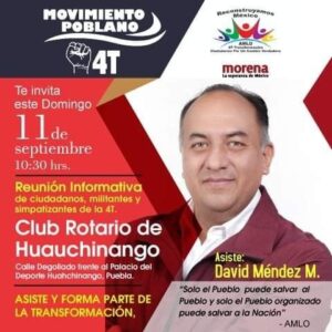 Este domingo 11 estará en el Club Rotario de Huauchinango, para encabezar la “Reunión informativa de ciudadanos, militantes y simpatizantes de la 4T”.