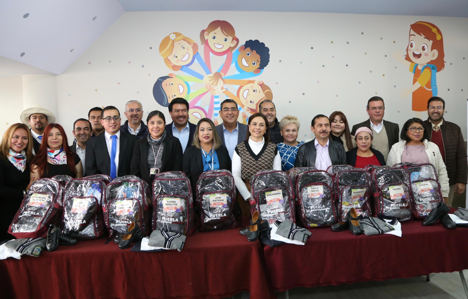 -El gobernador Sergio Salomón y la presidenta honoraria del Patronato, Gaby Bonilla presidieron la entrega de claves escolares para las casas de Asistencia, así como el otorgamiento de uniformes y materiales educativos
