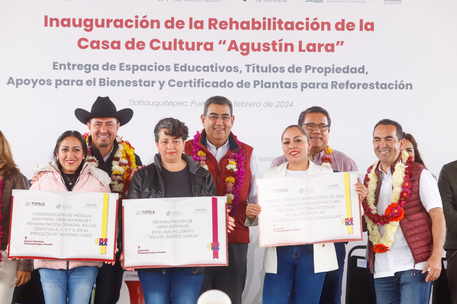 El mandatario estatal también entregó: un certificado de recepción de plantas para el Programa de Reforestación 2024, por 424 mil pesos; 91 mil 400 acciones para el bienestar de las familias poblanas (producto lácteo y calentadores solares), por más de 3 millones de pesos; 2 mil 500 mochilas del programa municipal “Continuar Estudiando”, con una inversión municipal de 1.4 millones de pesos; 15 títulos de propiedad urbanos y suburbanos, y dos constancias de construcción de espacios educativos por 2.2 millones de pesos.