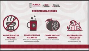 Finalmente, López Santos exhortó a la población en general a seguir las recomendaciones correspondientes durante esta temporada y abrigarse con ropa gruesa y calzado cerrado, evitar cambios bruscos de temperatura, no realizar actividades al aire libre, no hacer uso de anafres o braseros en lugares cerrados, proteger a las mascotas y consumir agua y frutas y verduras.