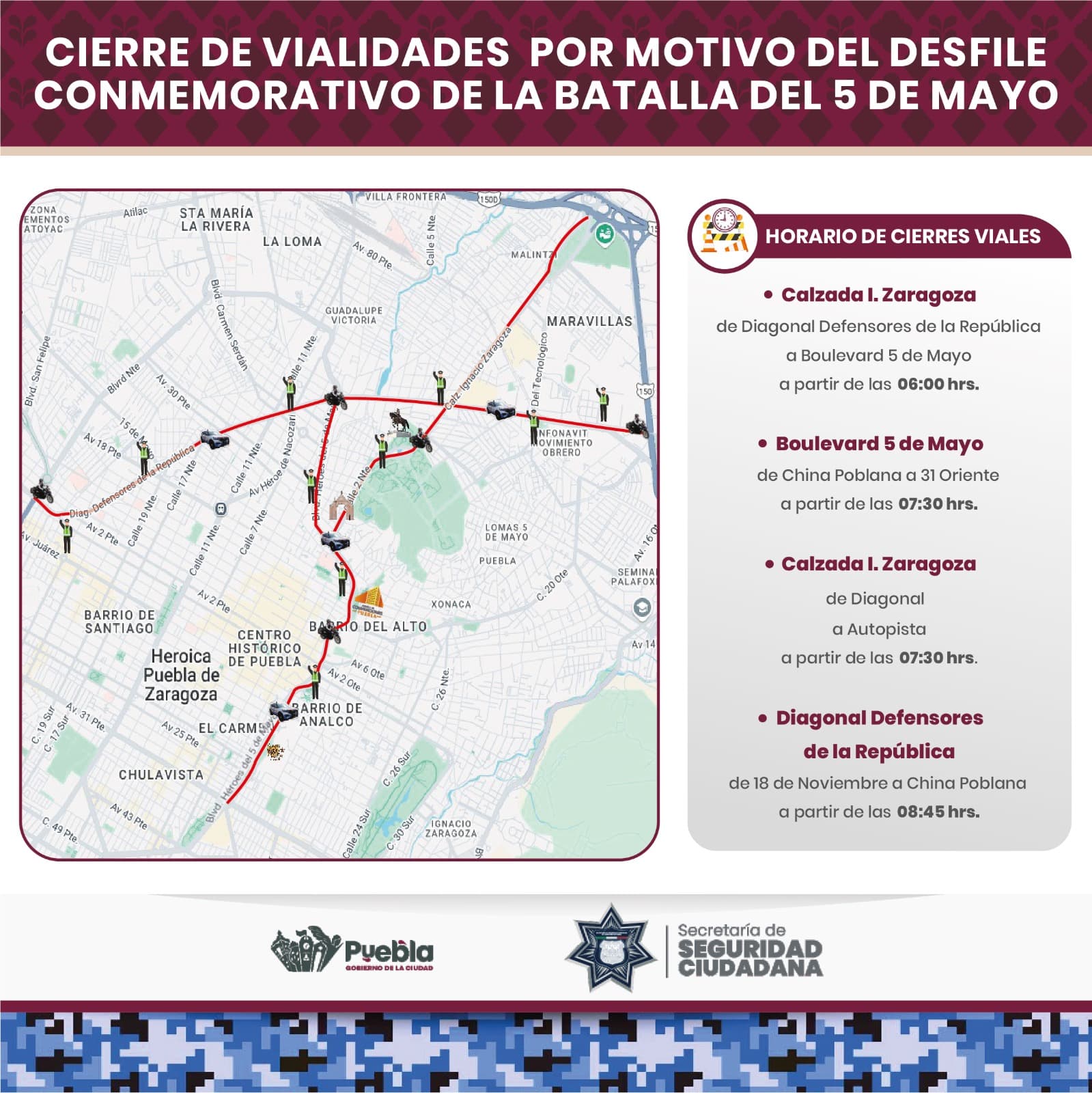 La Secretaría de Seguridad Ciudadana (SSC) informa que la Dirección General de Control de Tránsito, realizará cierres totales a la circulación a partir de las 06:00 horas del lunes 05 de mayo hasta las 16:30 horas del mismo día, derivado del Desfile Conmemorativo de la Batalla del 5 de Mayo en Puebla.