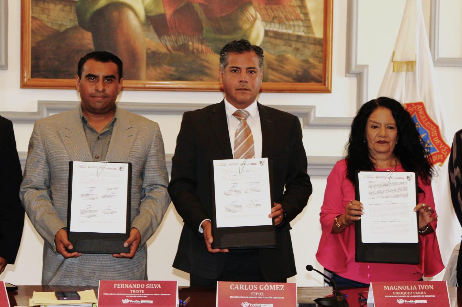 El titular de la secretaría Carlos Gómez Tepoz, destacó que esta firma permitirá facilitar la adquisición de productos no perecederos y utensilios de cocina que serán destinados a las Unidades Móviles Alimentarias y Comedores Comunitarios del municipio a precios más accesibles. Igualmente, resaltó el trabajo conjunto entre los tres niveles de gobierno para llevar los apoyos a las zonas donde más se necesita.