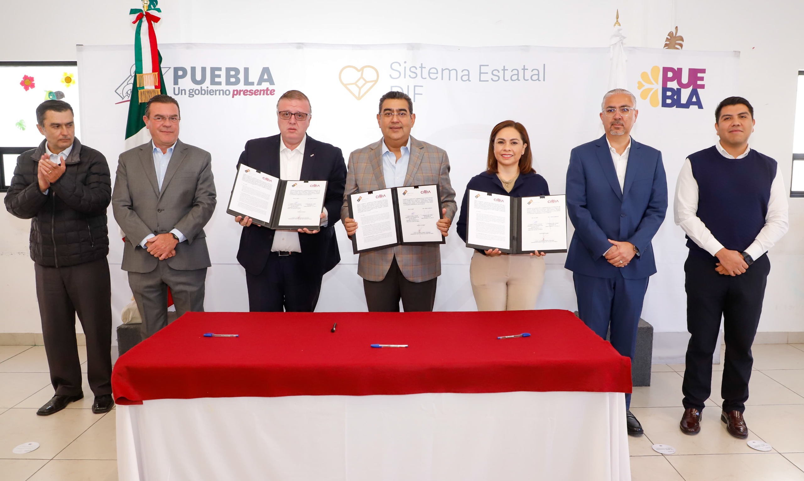-El gobernador Sergio Salomón; la presidenta honoraria del SEDIF, Gaby Bonilla; y la empresa CINIA firmaron un convenio de colaboración