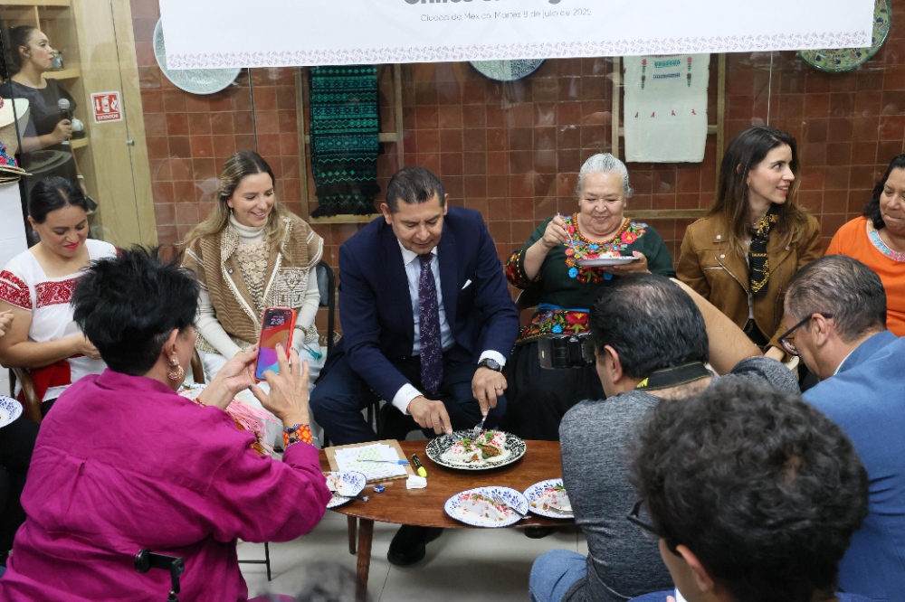Acompañado por cocineras tradicionales, artesanos productores de la marca “Puebla Cinco de Mayo” y funcionarios de su gabinete, el mandatario Alejandro Armenta resaltó que el Chile en Nogada le da identidad al Estado y a nuestro país, pues es sabor y color, además de representar a uno de los platillos tradicionales que aún conserva elementos artesanales en su preparación.