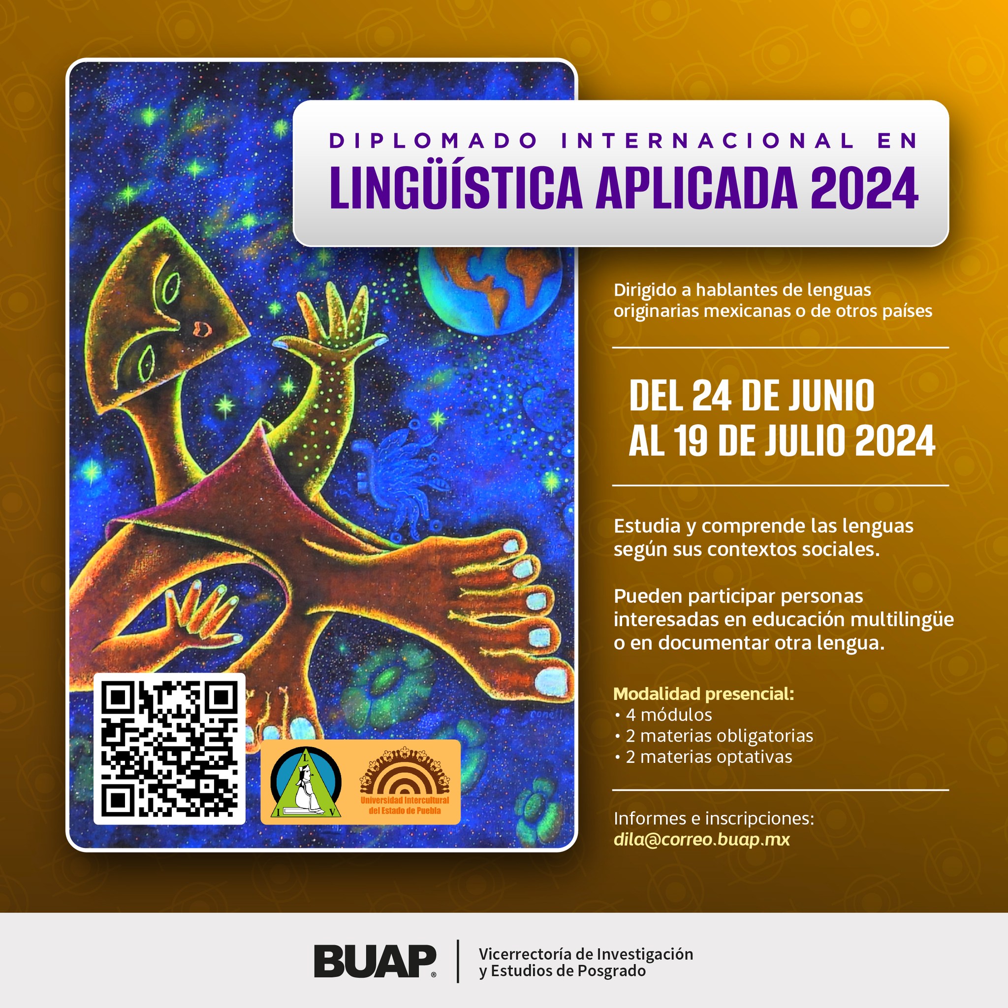 La Benemérita Universidad Autónoma de Puebla, convoca a hablantes de lenguas originarias mexicanas o de otros países al Diplomado Internacional en Lingüística Aplicada 2024, que se llevará a cabo el 24 de junio al 19 de julio de 2024, para continuar con una formación integral y de respeto a la cultura y tradición de los pueblos indígenas de nuestro Estado.