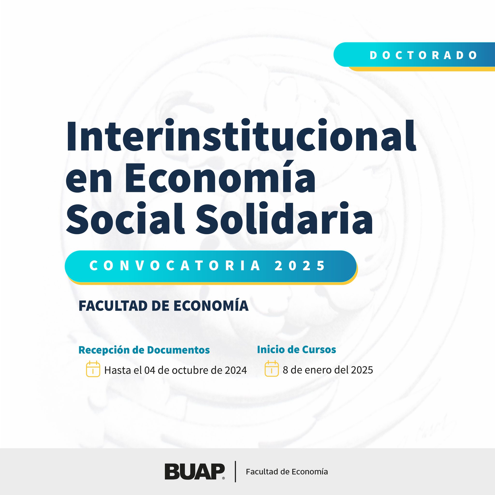 La Máxima Casa de Estudios del Estado de Puebla, amplia su oferta académica e invita a las y los interesados para formar parte de su Doctorado Interinstitucional en EconomÃa Social Solidaria en su modalidad presencial, que tiene como objetivo obtener los conocimientos necesarios para realizar una investigación crÃtica, reflexiva, creativa, analÃtica, propositiva, con capacidad organizativa y asociativa, que utilice teorÃas y metodologÃas de investigación cualitativa y cuantitativa con la finalidad de analizar y explicar los procesos de cambio socioeconómico que están emergiendo a nivel local, regional, nacional y global.