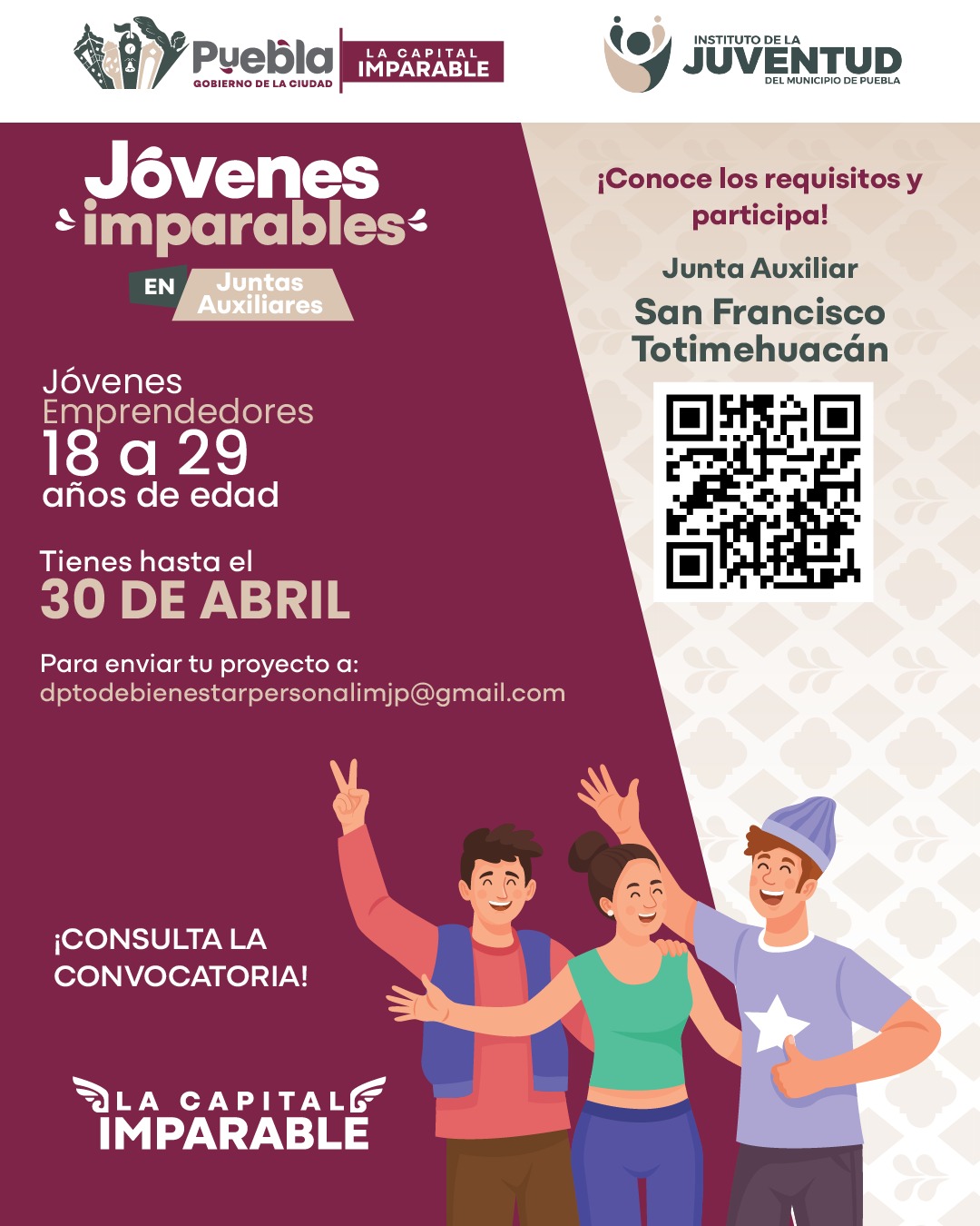 Con el propósito de fomentar el talento, la innovación y la autosuficiencia económica de las nuevas generaciones, el Instituto de la Juventud del Municipio de Puebla, bajo la dirección de Carolina Cabrera Victoria, emitió la convocatoria “Jóvenes Imparables, en juntas auxiliares”, un programa que, en esta edición, se implementará en la Junta Auxiliar de San Francisco Totimehuacán.