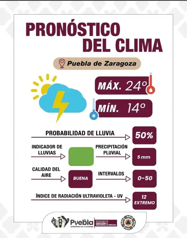 La Dirección de Gestión de Riesgos en materia de Protección Civil de la Secretaría de Gestión y Desarrollo Urbano, informa que se esperan condiciones parcialmente nubladas, con una probabilidad media de lluvias acompañadas de tormentas eléctricas durante la tarde, aproximadamente a las 17:00 horas. La acumulación de agua se estima entre 0 a 5 mm. Se recomienda a la ciudadanía tomar precauciones en caso de actividad eléctrica y mantenerse atentos a actualizaciones oficiales.