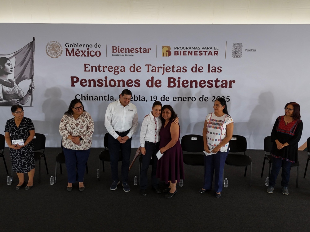 • En Chinantla, encabezó la entrega de 175 tarjetas del Banco del Bienestar a beneficiarias de la Pensión Mujeres Bienestar, apoyo que en todo el estado de Puebla se otorgará a 45 mil 818 mujeres de 63 y 64 años; así como de 270 tarjetas para la Pensión para el Bienestar de las Personas Adultas Mayores que a nivel estatal será entregado en 2025 a 32 mil 360 personas de 65 años y más