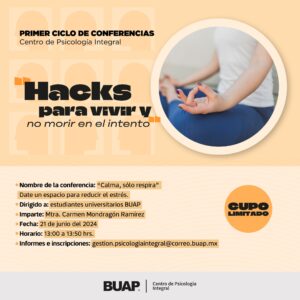 El Centro de Psicología Integral de la Benemérita Universidad Autónoma de Puebla, invita al Primer Ciclo de Conferencias “Hacks para vivir y no morir en el intento” que se celebrará el 21 y 28 de junio del 2024, dirigido a estudiantes universitarios.