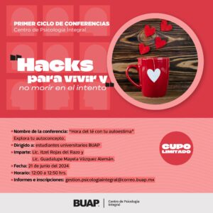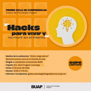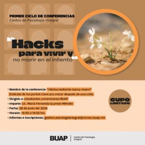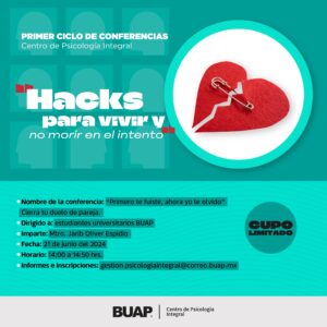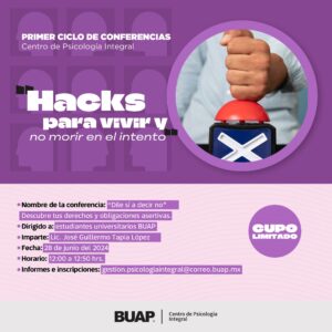 El Centro de Psicología Integral de la Benemérita Universidad Autónoma de Puebla, invita al Primer Ciclo de Conferencias “Hacks para vivir y no morir en el intento” que se celebrará el 21 y 28 de junio del 2024, dirigido a estudiantes universitarios.