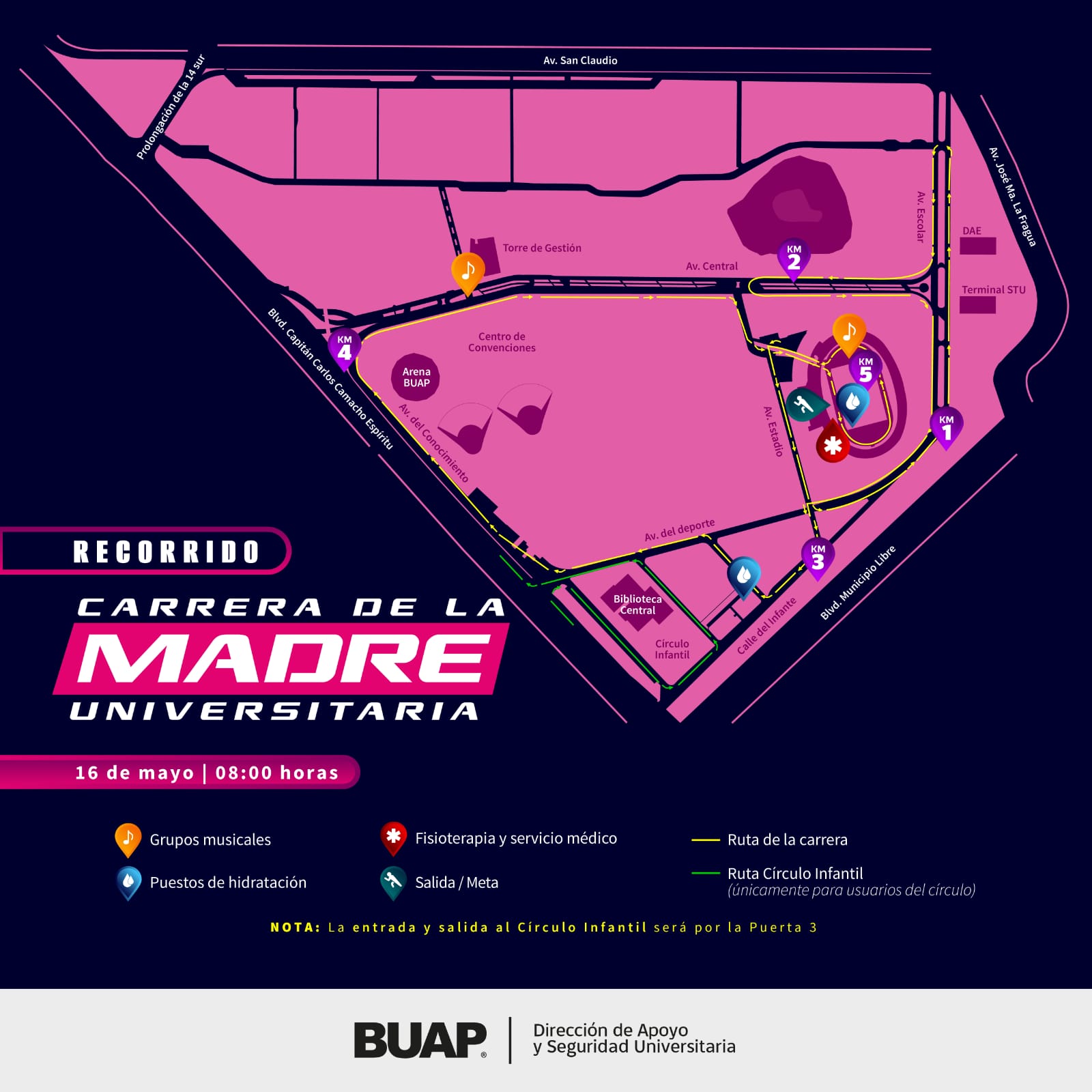 La Benemérita Universidad Autónoma de Puebla que se llevará a cabo el día 16 de mayo de 2024 a las 8:00 hrs en el Estadio Universitario, las inscripciones se efectuarán en la Central de Inscripciones del Complejo Deportivo Universitario y de alto Rendimiento, de lunes a viernes de 8:00 a 19:00 hrs. y sábado de 9:00 a 13:00 hrs.