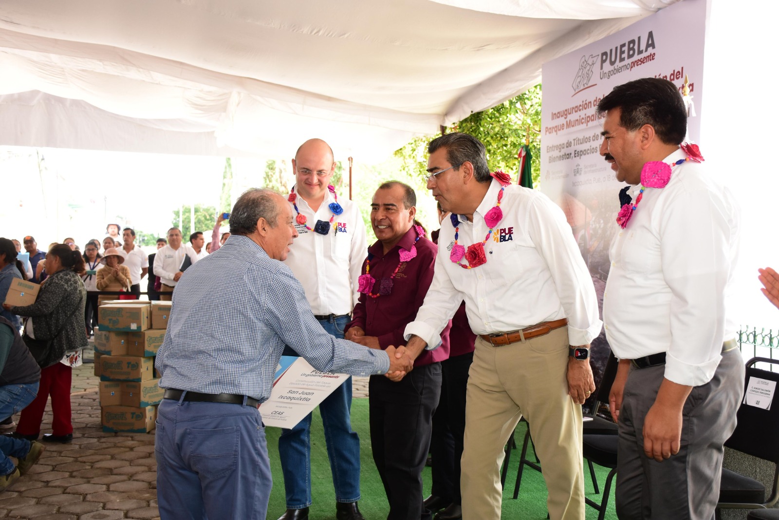 -En Ixcaquixtla, el mandatario presidió la inauguración de la rehabilitación del Parque Municipal, así como el otorgamiento de beneficios para el bienestar, títulos de propiedad y certificados de construcción de espacios educativos