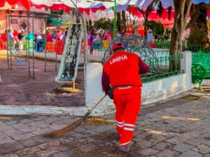 La campaña incluyó, además, labores de hidrolavado en explanadas y kioscos, la ejecución de chapeo en banquetas, así como el retiro de publicidad y la limpieza de espacios emblemáticos de las Juntas Auxiliares.