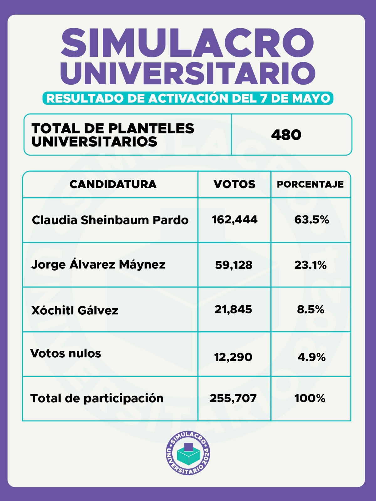 Con el éxito de este ejercicio que alcanzó los *255,707 votos a nivel nacional*, somos conscientes del papel que juega la comunidad universitaria en la decisión sobre el rumbo del país: con el Simulacro Universitario, logramos realizar la medición de intención de voto más grande que se haya hecho en el país rumbo a las elecciones del 2024, al tiempo que promovimos la participación en las elecciones del próximo 2 de junio, sobre todo para quienes votarán por primera vez, con un ensayo de cómo será este día.