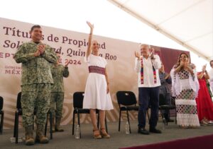 En la Cuarta Transformación, la prosperidad es para todos y todas, fue el mensaje que la Presidenta electa de México, Claudia Sheinbaum Pardo compartió con el pueblo de Quintana Roo, durante la entrega de títulos de propiedad a la colonia Colosio en el municipio de Solidaridad, que presidió el Presidente Andrés Manuel López Obrador.